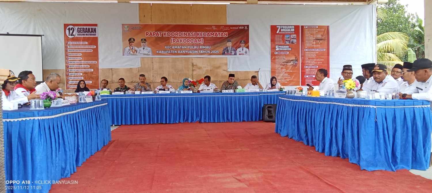 Banyuasin, Sumsel, – Pemerintah Kecamatan Pulau Rimau, Kabupaten Banyuasin, menggelar Rapat Koordinasi Kecamatan (Korcam) Tahun 2025 yang dihadiri oleh unsur Forkopimcam, UPTD, pendamping sosial, forum kepala desa, BPD, serta TP PKK se-Kecamatan Pulau Rimau.